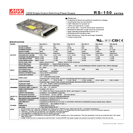 RS-150-12 CaseSingle outputLED indikace stavuPasivní chlazeníPoužité 105°C elektrolytické long-life kondenzátoryTestován na 5G vibraceRozsah vstupního napětí: 88...132/176...264V AC47...63Hz a 248...373V DCPřepínač vstupního napětí: 115V/230VAutomatické vypnutí při přetížení, re-power-onOdolný vůči zkratu100% burn-in-test při plném zatíženíZabudovaný odrušovací filtr, nízké zbytkové vlnění2,0A jmenovitý vstupní proud 230V40A rázový proud při startu za studena 230VRozsah provozní teploty od -25 až +70°C (testovány i vyžší teploty)Ochrana proti přetížení: 110...150%Ochrana proti přepjetí: 115...135%Izolační napětí od vstupu do výstupu 3000V ACIzolační napětí od vstupu k uzemňovacímu kabelu 1500V ACIzolační napětí výstupu k uzemňovacímu kabelu 500V ACIzolační odpor od vstupu do výstupu: 100M?Izolační odpor od vstupu k uzemňovacímu kabelu 100M?Izolační odpor od výstupu k uzemňovacímu kabelu 100M?28 ms - doba překlenutí výpadku sítě při 230VRozměry: 199x98x38Hmotnost: 700g